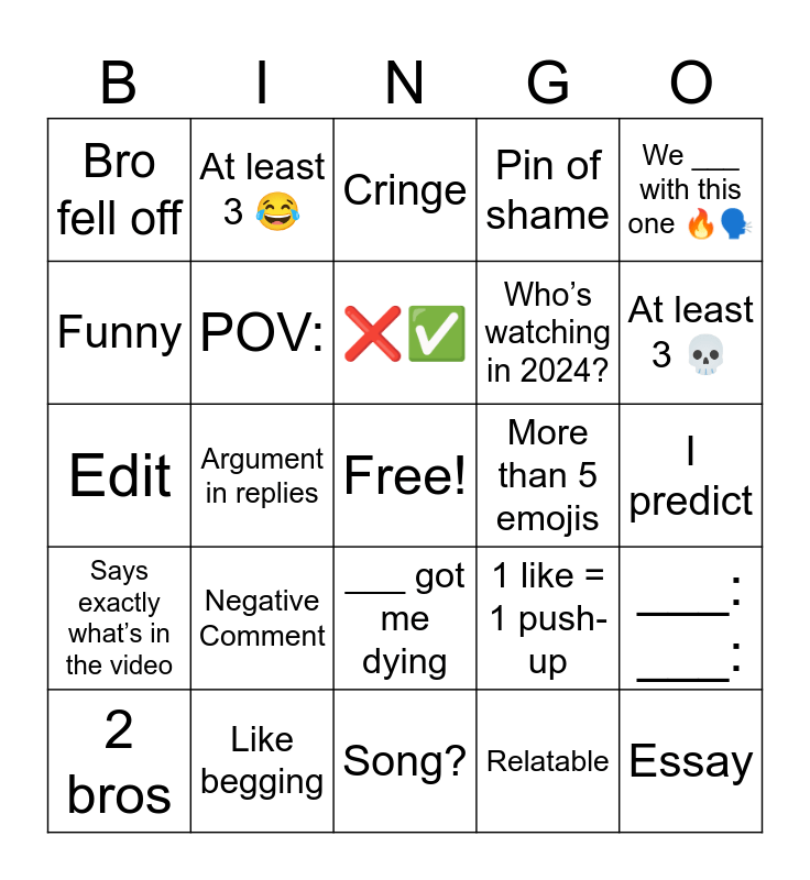 This bingo card has a free space and 24 words: Negative Comment, Like begging, ββ , 2 bros, We ___ with this one π₯π£οΈ, Bro fell off, Funny, At least 3 π, More than 5 emojis, ___ got me dying, Whoβs watching in 2024?, Edit, 1 like = 1 push-up, ___: ___:, POV:, Relatable, I predict, Cringe, At least 3 π, Argument in replies, Essay, Says exactly whatβs in the video, Pin of shame and Song?.