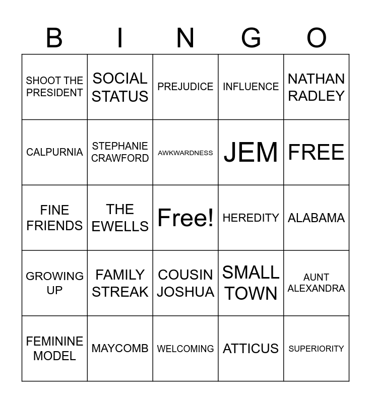 This bingo card has a free space and 28 words: AUNT ALEXANDRA, SCOUT, JEM, ATTICUS, CALPURNIA, PREJUDICE, SOCIAL STATUS, GROWING UP, HEREDITY, FEMININE MODEL, FINE FRIENDS, INFLUENCE, MAYCOMB, WELCOMING, FREE, INCESTUOS STREAK, FAMILY STREAK, STEPHANIE CRAWFORD, AWKWARDNESS, COUSIN JOSHUA, SHOOT THE PRESIDENT, MEDITATIONS OF JOSHUA S. ST. CLAIR., SUPERIORITY, THE EWELLS, ALABAMA, SMALL TOWN, NATHAN RADLEY and THE FINCH LEGACY.