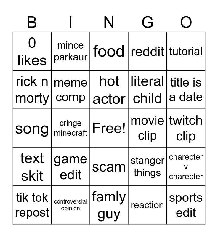 This bingo card has a free space and 24 words: game edit, controversial opinion, hot actor, tik tok repost, tutorial, 0 likes, rick n morty, mince parkaur, movie clip, scam, literal child, song, stanger things, charecter v charecter, meme comp, reaction, twitch clip, food, title is a date, cringe minecraft, sports edit, text skit, reddit and famly guy.