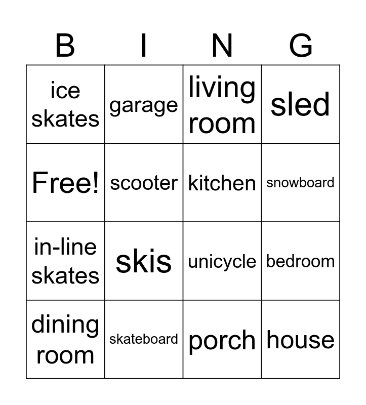 This bingo card has 16 words: skateboard, bedroom, living room, ice skates, in-line skates, garage, unicycle, porch, Free!, scooter, dining room, sled, skis, snowboard, kitchen and house.