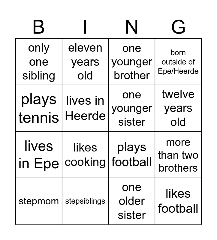 This bingo card has 29 words: Free!, more than two sisters, more than two brothers, only child, only one sibling, one younger brother, one younger sister, more than two siblings, stepsiblings, one older brother, one older sister, stepmom, stepdad, isn't fond of sports, likes cooking, likes dancing, likes listening to music, likes football, plays tennis, plays football, likes watching netflix, likes watching youtube, lives in Epe, lives in Heerde, born outside of Epe/Heerde, eleven years old, middle child, twelve years old and likes watching football.