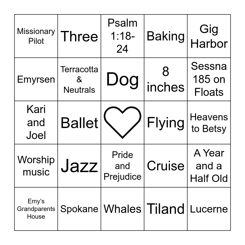 This bingo card has a free space and 30 words: Spokane, October 26, 2024, Ballet, Neonatal Nurse, Missionary Pilot, Psalm 1:18-24, Terracotta & Neutrals, Pride and Prejudice, Flying, Whales, Heavens to Betsy, Lucerne, Tiland, Diet Coke, Sessna 185 on Floats, County Fair, Cruise, Worship music, Jazz, Gig Harbor, Kari and Joel, Jared & Alyssa, Three, 8 inches, Emyrsen, Baking, A Year and a Half Old, Emy’s Grandparents House, Dog and Manson.