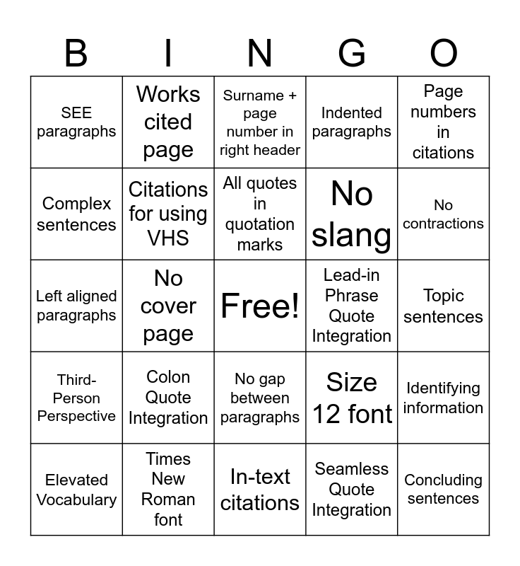 This bingo card has a free space and 24 words: Colon Quote Integration, Times New Roman font, All quotes in quotation marks, Elevated Vocabulary, Page numbers in citations, SEE paragraphs, Complex sentences, Works cited page, Lead-in Phrase Quote Integration, No gap between paragraphs, No slang, Left aligned paragraphs, Size 12 font, Identifying information, Citations for using VHS, Seamless Quote Integration, Topic sentences, Surname + page number in right header, No contractions, No cover page, Concluding sentences, Third-Person Perspective, Indented paragraphs and In-text citations.