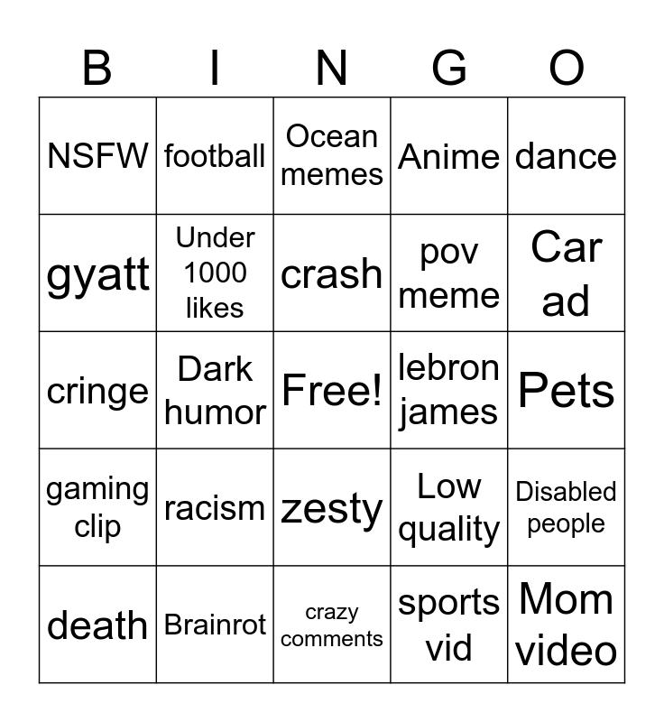 This bingo card has a free space and 24 words: racism, Brainrot, crash, death, dance, NSFW, gyatt, football, lebron james, zesty, pov meme, cringe, Low quality, Disabled people, Under 1000 likes, sports vid, Pets, Ocean memes, Car ad, Dark humor, Mom video, gaming clip, Anime and crazy comments.