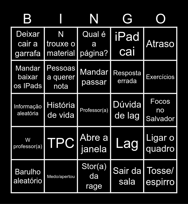 This bingo card has a free space and 29 words: Barulho aleatório, Sumário?, História de vida, “Qual é a lição”, Deixar cair a garrafa, Qual é a página?, Pessoas a querer nota, TPC, Dúvida de lag, Medo/apertou, Focos no Salvador, Tosse/ espirro, Stor(a) da rage, Sair da sala, Exercícios, Mandar calar, Abre a janela, W professor(a), Atraso, Informação aleatória, Lag, Alguém n fez o TPC, Resposta errada, Mandar baixar os IPads, iPad cai, N trouxe o material, Ligar o quadro, Mandar passar and Beber água.