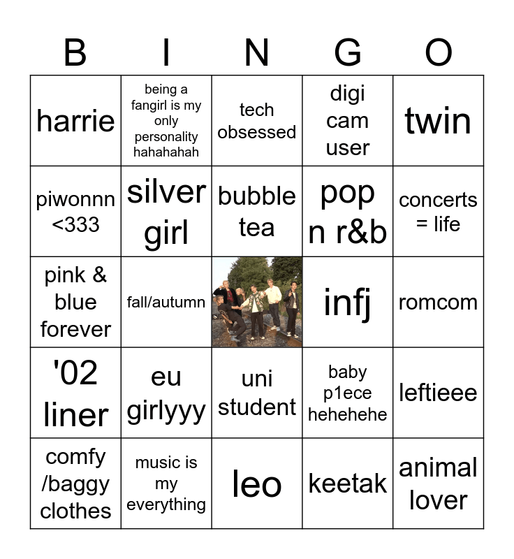 This bingo card has a free space and 24 words: eu girlyyy, music is my everything, bubble tea, comfy /baggy clothes, twin, harrie, piwonnn <333, being a fangirl is my only personality hahahahah, infj, uni student, pop n r&b, pink & blue forever, baby p1ece hehehehe, leftieee, silver girl, keetak, romcom, tech obsessed, concerts = life, fall/autumn, animal lover, '02 liner, digi cam user and leo.
