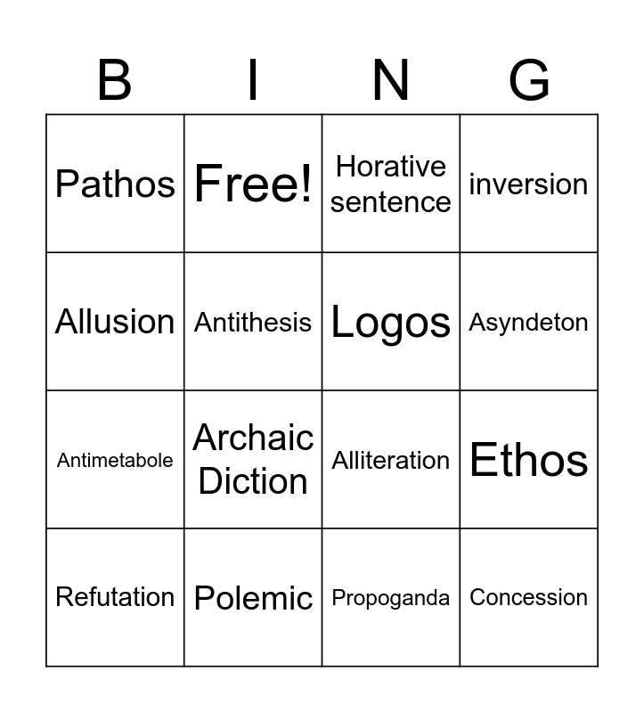 This bingo card has 19 words: Alliteration, Connotation/ denotation, Horative sentence, Concession, Ethos, Allusion, Propoganda, Pathos, Free!, Antimetabole, Archaic Diction, Antithesis, Logos, Polemic, Refutation, Cummulative sentence, inversion, Asyndeton and Archaic diction.