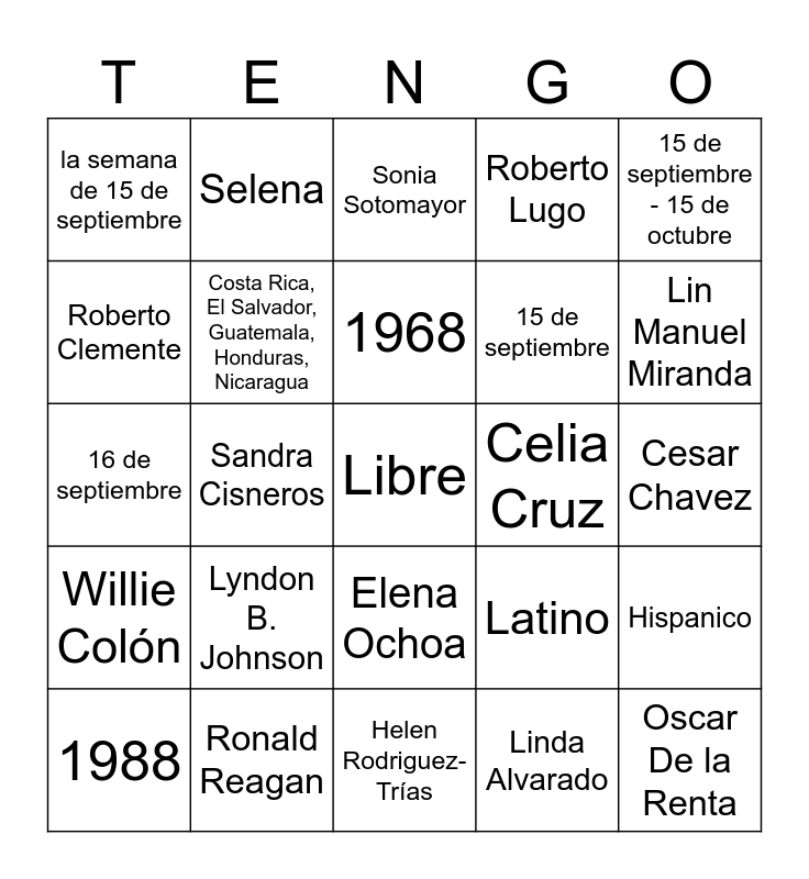 This bingo card has a free space and 24 words: Lyndon B. Johnson, Ronald Reagan, 1968, 1988, 15 de septiembre - 15 de octubre, la semana de 15 de septiembre, Roberto Clemente, Selena, Celia Cruz, Elena Ochoa, 15 de septiembre, 16 de septiembre, Latino, Hispanico, Costa Rica, El Salvador, Guatemala, Honduras, Nicaragua, Linda Alvarado, Cesar Chavez, Sonia Sotomayor, Lin Manuel Miranda, Sandra Cisneros, Oscar De la Renta, Willie Colón, Roberto Lugo and Helen Rodriguez-Trías.