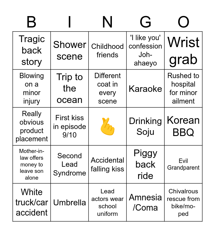 This bingo card has a free space and 24 words: Second Lead Syndrome, Umbrella, Different coat in every scene, White truck/car accident, Wrist grab, Tragic back story, Blowing on a minor injury, Shower scene, Drinking Soju, Accidental falling kiss, Karaoke, Really obvious product placement, Piggy back ride, Evil Grandparent, Trip to the ocean, Amnesia /Coma, Korean BBQ, Childhood friends, Rushed to hospital for minor ailment, First kiss in episode 9/10, Chivalrous rescue from bike/mo-ped, Mother-in-law offers money to leave son alone, 'I like you' confession Joh-ahaeyo and Lead actors wear school uniform.