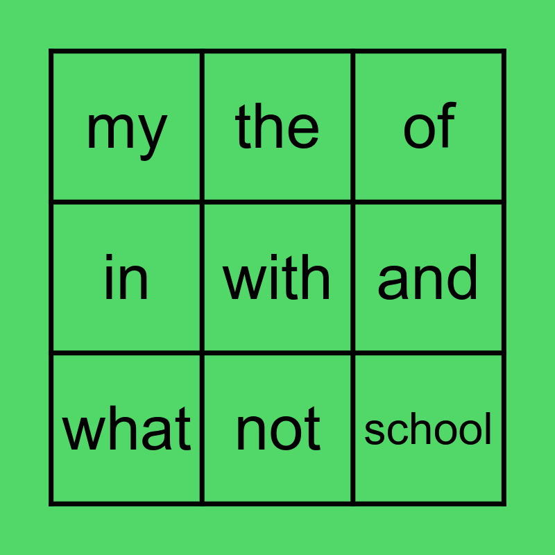 This bingo card has a free space and 11 words: does, not, school, what, the, of, and, to, in, my and look.