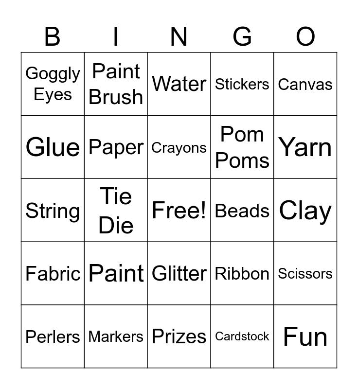 This bingo card has a free space and 24 words: Paint, Markers, Crayons, Perlers, Canvas, Goggly Eyes, Glue, Paint Brush, Beads, Glitter, Pom Poms, String, Ribbon, Scissors, Paper, Cardstock, Clay, Water, Yarn, Tie Die, Fun, Fabric, Stickers and Prizes.