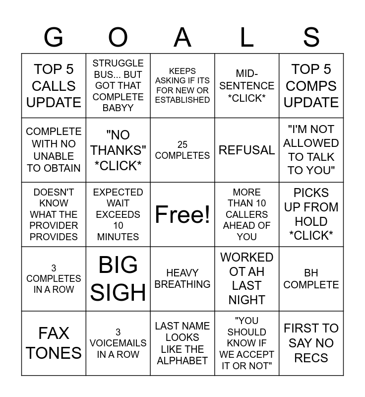 This bingo card has a free space and 24 words: BIG SIGH, 3 VOICEMAILS IN A ROW, 25 COMPLETES, FAX TONES, TOP 5 COMPS UPDATE, TOP 5 CALLS UPDATE, COMPLETE WITH NO UNABLE TO OBTAIN, STRUGGLE BUS... BUT GOT THAT COMPLETE BABYY, MORE THAN 10 CALLERS AHEAD OF YOU, HEAVY BREATHING, REFUSAL, DOESN'T KNOW WHAT THE PROVIDER PROVIDES, WORKED OT AH LAST NIGHT, BH COMPLETE, "NO THANKS" *CLICK*, "YOU SHOULD KNOW IF WE ACCEPT IT OR NOT", PICKS UP FROM HOLD *CLICK*, KEEPS ASKING IF ITS FOR NEW OR ESTABLISHED, "I'M NOT ALLOWED TO TALK TO YOU", EXPECTED WAIT EXCEEDS 10 MINUTES, FIRST TO SAY NO RECS, 3 COMPLETES IN A ROW, MID-SENTENCE *CLICK* and LAST NAME LOOKS LIKE THE ALPHABET.