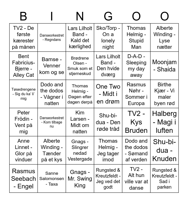 This bingo card has 36 words: Thomas Helmig - Jeg tager imod, Gnags - Slingrer nedad Vestergade, Rungsted & Kreutzfeldt - Jeg ved det godt, Bent Fabricius-Bjerre - Alley Cat, Peter Frödin - Vent på mig, One Two - Midt i en drøm, Bamse - Venner kom og se, Gnags - Mr. Swing King, Thomas Helmig - Stupid Man, Dodo and the dodos - Sømand af verden, Moonjam - Shaida, Sko/Torp - On a lonely night, Shu-bi-dua - Knuden, Dodo and the dodos - Vågner i natten, Lars Lilholt Band - Den hvide dværg, TV2 - De første kærester på månen, Anne Linnet - Glor på vinduer, Rasmus Nøhr - Sommer i Europa, Tøsedrengene - Sig du ka’ li’ mig, Lars Lilholt Band - Kald det kærlighed, Thomas Helmig - Dagen efter dagen derpå, Danseorkestret - Kom tilbage nu, Shu-bi-dua - Den røde tråd, Kim Larsen - Midt om natten, TV2 - Kys Bruden, Danseorkestret - Regndans, D-A-D - Sleeping my day away, Sanne Salomonsen - Taxa, Brødrene Olsen - Smuk som et stjerneskud, Alberte Winding - Lyse nætter, Rungsted & Kreutzfeldt - Sad i parken, Rasmus Seebach - Engel, Halberg - Magi i luften, Birthe Kjær - Vi maler byen rød, Alberte Winding - Tænder på et kys and TV2 - Alt hun ville var at danse.