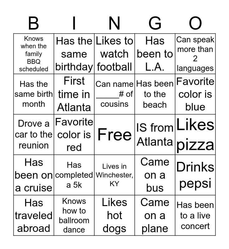 This bingo card has a free space and 24 words: Has completed a 5k, Knows how to ballroom dance, Can name _____# of cousins, Has traveled abroad, Can speak more than 2 languages, Knows when the family BBQ scheduled, Has the same birth month, Has the same birthday, IS from Atlanta, Lives in Winchester, KY, Has been to the beach, Drove a car to the reunion, Came on a bus, Drinks pepsi, First time in Atlanta, Came on a plane, Likes pizza, Likes to watch football, Favorite color is blue, Favorite color is red, Has been to a live concert, Has been on a cruise, Has been to L.A. and Likes hot dogs.