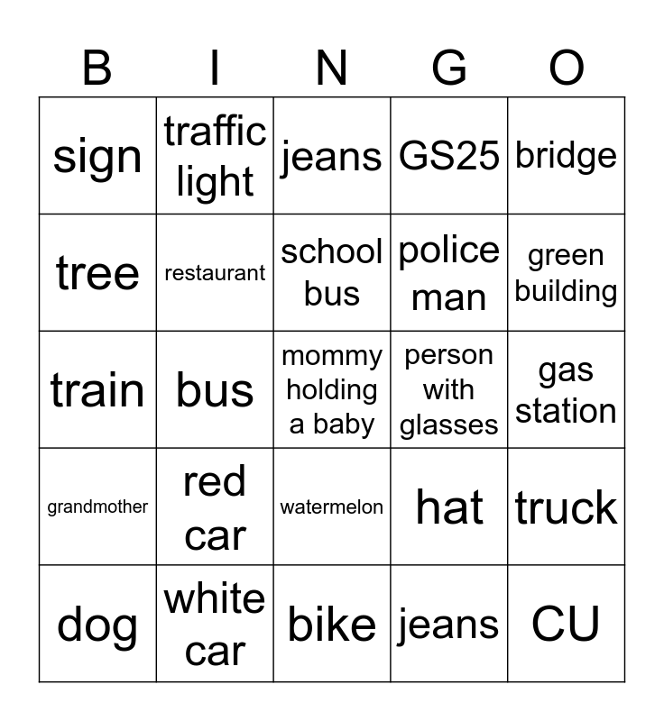This bingo card has 25 words: red car, bike, school bus, dog, bridge, sign, tree, traffic light, person with glasses, watermelon, police man, train, hat, truck, restaurant, CU, gas station, jeans, green building, bus, mommy holding a baby, white car, grandmother, GS25 and jeans.
