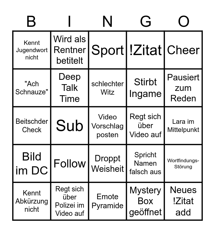 This bingo card has a free space and 24 words: Follow, Regt sich über Polizei im Video auf, schlechter Witz, Kennt Abkürzung nicht, Cheer, Kennt Jugendwort nicht, "Ach Schnauze", Wird als Rentner betitelt, Regt sich über Video auf, Droppt Weisheit, Stirbt Ingame, Beitschder Check, Spricht Namen falsch aus, Wortfindungs- Störung, Deep Talk Time, Mystery Box geöffnet, Lara im Mittelpunkt, Sport, Pausiert zum Reden, Sub, Neues !Zitat add, Bild im DC, !Zitat and Emote Pyramide.