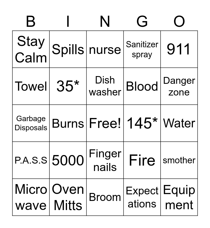 This bingo card has a free space and 41 words: Paper Towel, Garbage Disposals, Clean-Up, 35*, Oven Mitts, Finger nails, Dish washer, Apron, 911, P.A.S.S, Burns, Sanitizer spray, Equip ment, Water, 145*, 5000, Bandaid, Stay Calm, card board, nurse, smother, knife, Broom, Blood, Drying Rack, Laundry, Expect ations, Mrs. C, Danger zone, 165*, Cross Contam ination, Spills, Micro wave, Unplug, Fire, Towel, Wash hands, tardy, who, where, what, 135* and hair tie.