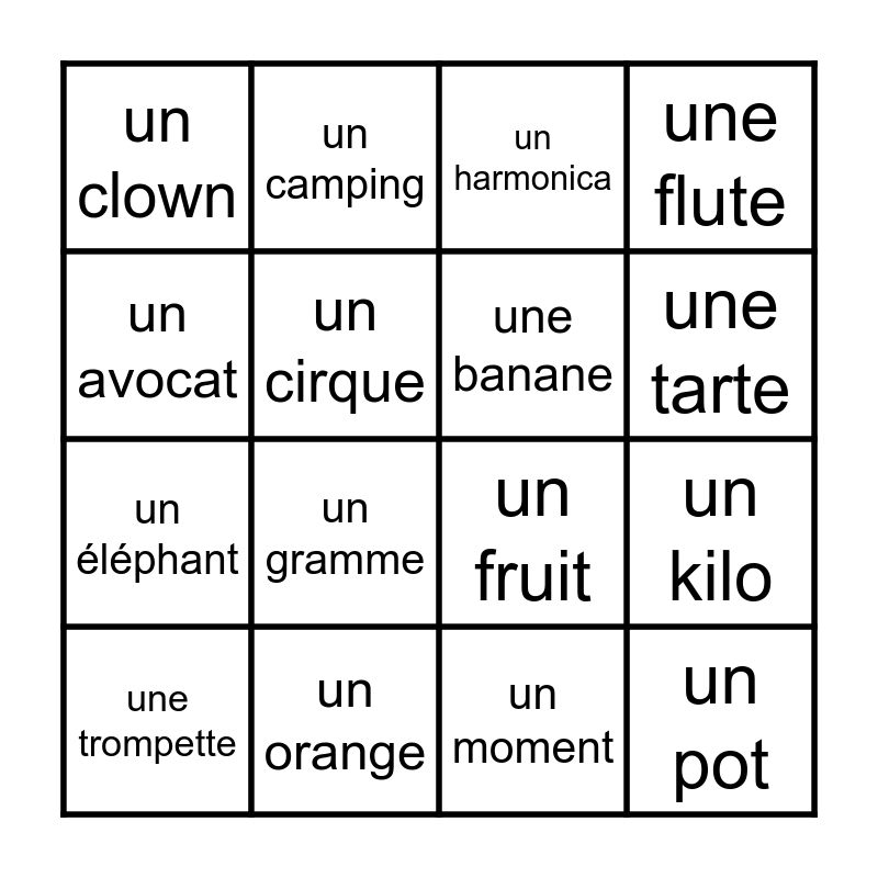 This bingo card has 19 words: un fruit, un saxophone, un harmonica, un pot, un kilo, un avocat, un moment, un clown, un camping, un éléphant, un gramme, un cirque, une banane, un orange, une trompette, une clarinette, une flute, une tarte and une personne.