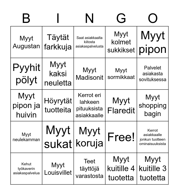This bingo card has 25 words: Myyt sukat, Teet täyttöjä varastosta, Myyt Madisonit, Kehut työkaverin asiakaspalvelua, Myyt pipon, Myyt Augustan, Pyyhit pölyt, Täytät farkkuja, Myyt Flaredit, Myyt koruja, Myyt sormikkaat, Myyt pipon ja huivin, Free!, Kerrot asiakkaalle jonkun tuotteen ominaisuuksista, Myyt kaksi neuletta, Myyt kuitille 3 tuotetta, Myyt shopping bagin, Saat asiakkaalta kiitosta asiakaspalvelusta, Palvelet asiakasta sovituksessa, Höyrytät tuotteita, Kerrot eri lahkeen pituuksista asiakkaalle, Myyt Louisvillet, Myyt neulekamman, Myyt kolmet sukkikset and Myyt kuitille 4 tuotetta.