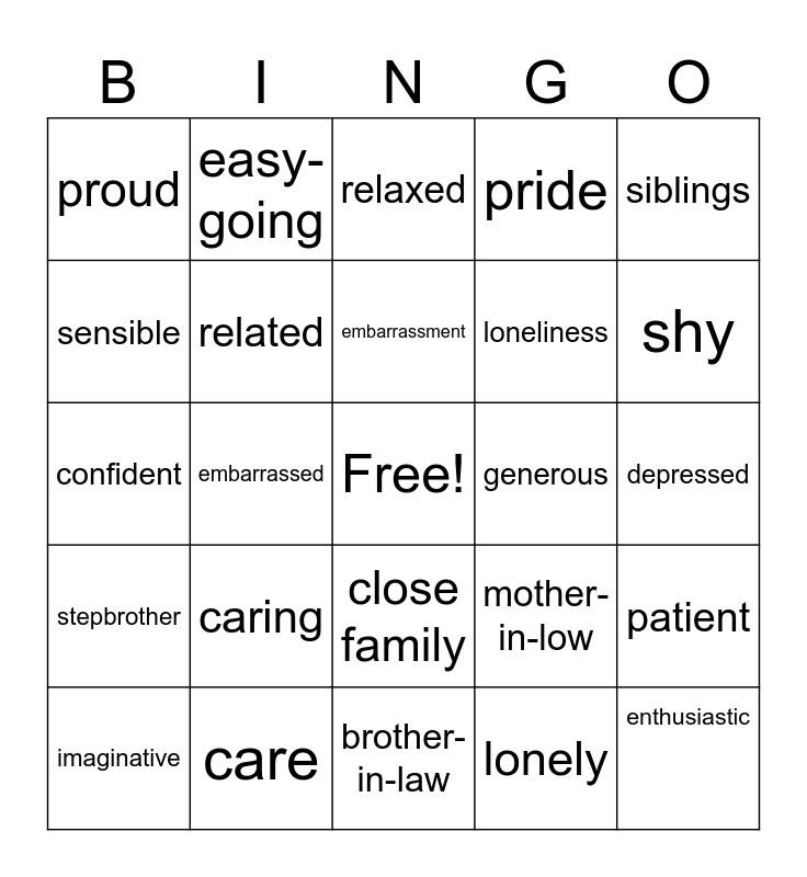 This bingo card has a free space and 24 words: caring, care, embarrassment, imaginative, siblings, proud, sensible, easy-going, generous, close family, loneliness, confident, mother-in-low, patient, related, lonely, depressed, relaxed, shy, embarrassed, enthusiastic, stepbrother, pride and brother-in-law.