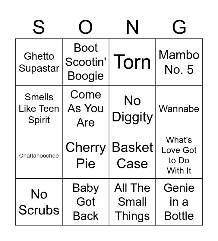 This bingo card has 44 words: Bye Bye Bye, No Scrubs, I Want It That Way, Say My Name, Thunderstruck, …Baby One More Time, Torn, Waterfalls, Smells Like Teen Spirit, Jumpin', Jumpin', Mambo No. 5, Baby Got Back, Be My Lover, Butterfly, Zombie, Gangsta's Paradise, What's My Age Again, Basket Case, Mr. Jones, Cherry Pie, Boot Scootin' Boogie, I Got Friends in Low Places, Oops!...I Did It Again, Ghetto Supastar, Two Princes, All The Small Things, Creep, It Must Have Been Love, My Own Worst Enemy, Genie in a Bottle, The Distance, Ironic, Time After Time, Don't Speak, What's Love Got to Do With It, The Sign, I Wanna Dance with Somebody, It's Gonna Be Me, Wannabe, Come As You Are, Chattahoochee, Shoop, No Diggity and Something Like That.