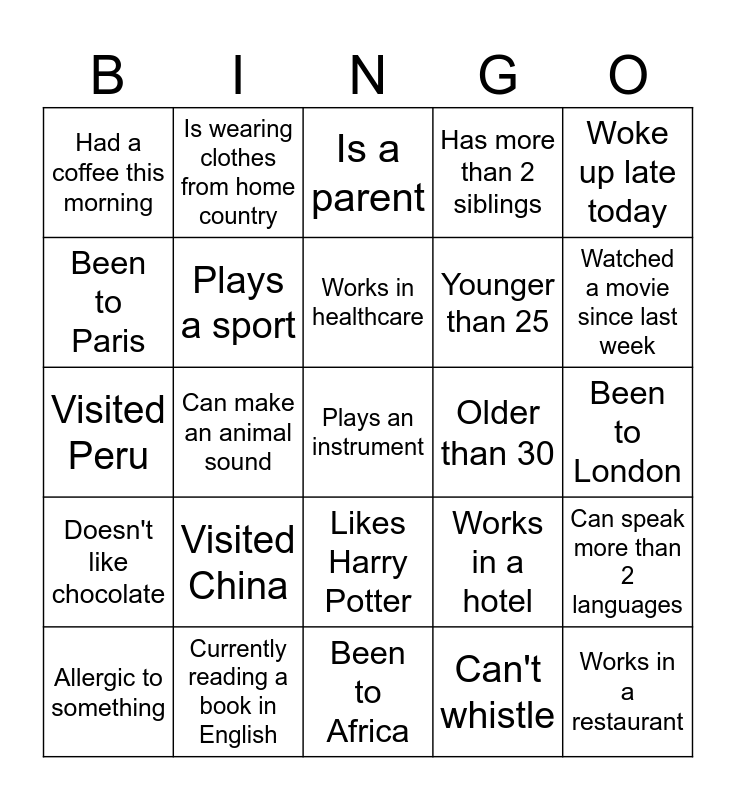 This bingo card has a free space and 24 words: Visited China, Currently reading a book in English, Works in healthcare, Allergic to something, Woke up late today, Had a coffee this morning, Been to Paris, Is wearing clothes from home country, Older than 30, Likes Harry Potter, Younger than 25, Visited Peru, Works in a hotel, Can speak more than 2 languages, Plays a sport, Can't whistle, Been to London, Is a parent, Watched a movie since last week, Can make an animal sound, Works in a restaurant, Doesn't like chocolate, Has more than 2 siblings and Been to Africa.