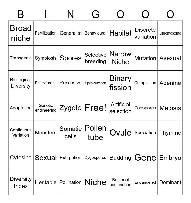 This bingo card has a free space and 70 words: Variation, Biological Diversity, Species, Speciation, Adaptation, Structural, Behavioural, Diversity Index, Habitat, Environment, Competition, Niche, Broad niche, Generalist, Specialist, Narrow Niche, Specialization, Symbiosis, Heritable, Reproduction, Asexual, Binary fission, Spores, Zoospores, Meristem, Budding, Sexual, Zygospores, Zygote, Embryo, Fertilization, Pollination, Pistil, Stamen, Ovule, Pollen tube, Bacterial conjunction, Genetics, Continuous Variation, Discrete variation, Dominant, Recessive, Mutation, Mutagen, DNA, Chromosome, Adenine, Thymine, Guanine, Cytosine, Gene, Mitosis, Meiosis, Somatic cells, Genetic engineering, Biotechnologies, Transgenic, Aquaculture, Domestic, Artificial selection, Selective breeding, Natural selection, Conservation, Extirpation, Endangered, Extinct, Bioindicator species, Seed banks, Global treaties and Protected Areas.