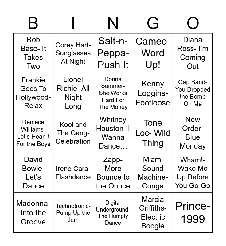 This bingo card has 29 words: Madonna- Into the Groove, Rick James- Super Freak, Kool and The Gang- Celebration, Prince- 1999, Rob Base- It Takes Two, Salt-n-Peppa- Push It, Lionel Richie- All Night Long, Irene Cara- Flashdance, Tone Loc- Wild Thing, Technotronic- Pump Up the Jam, New Order- Blue Monday, Whitney Houston- I Wanna Dance…, Digital Underground- The Humpty Dance, Marcia Griffiths- Electric Boogie, Gap Band- You Dropped the Bomb On Me, DeBarge- Rhythm of the Night, Zapp- More Bounce to the Ounce, David Bowie- Let’s Dance, Diana Ross- I’m Coming Out, Deniece Williams- Let’s Hear It For the Boys, Miami Sound Machine- Conga, Dead or Alive- You Spin Me Around, Kenny Loggins- Footloose, Frankie Goes To Hollywood- Relax, Cameo- Word Up!, Corey Hart- Sunglasses At Night, Wham!- Wake Me Up Before You Go-Go, Donna Summer- She Works Hard For The Money and Depeche Mode- Just Can’t Get Enough.
