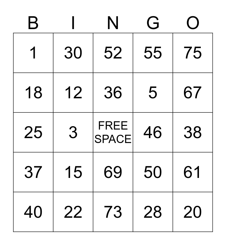 This bingo card has a free space and 24 words: 15, 22, 36, 40, 75, 1, 18, 30, 46, 69, 5, 25, 50, 61, 12, 28, 38, 52, 67, 3, 20, 37, 55 and 73.