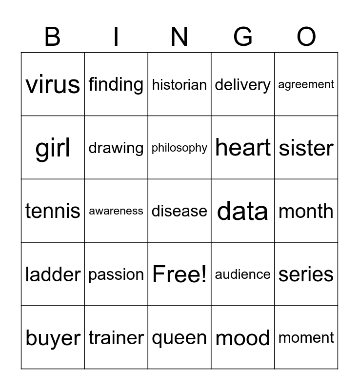 This bingo card has 26 words: Free!, buyer, drawing, newspaper, delivery, agreement, girl, finding, philosophy, mood, sister, tennis, trainer, queen, data, moment, virus, passion, historian, audience, month, ladder, awareness, disease, heart and series.