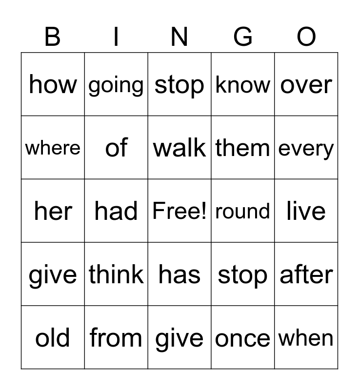 This bingo card has a free space and 29 words: old, may, had, then, how, stop, of, think, round, from, live, when, give, once, every, an, has, give, over, her, stop, ask, them, where, know, going, after, walk and fly.