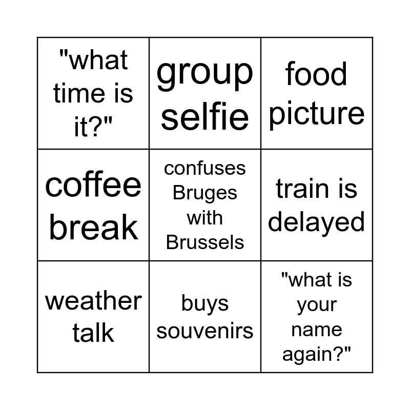 This bingo card has a free space and 8 words: train is delayed, food picture, group selfie, weather talk, "what time is it?", "what is your name again?", coffee break and buys souvenirs.