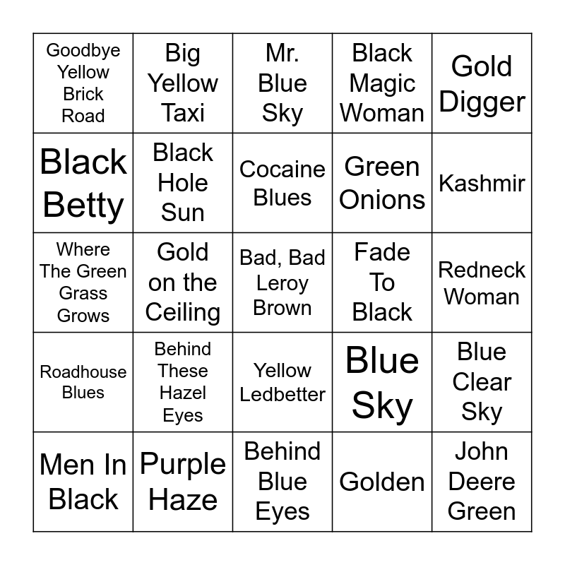 This bingo card has 51 words: Back In Black, Bad, Bad Leroy Brown, Barefoot Blue Jean Night, Behind Blue Eyes, Behind These Hazel Eyes, Big Green Tractor, Big Yellow Taxi, Black and Yellow, Black Betty, Black Dog, Black Hole Sun, Black Magic Woman, Blue Clear Sky, Blue Sky, Blue Suede Shoes, Blue World, Cocaine Blues, Fade To Black, Folsom Prison Blues, Gold Digger, Gold on the Ceiling, Golden, Goodbye Yellow Brick Road, Green Onions, Itsy Bitsy Teenie Weenie Yellow Polka-Dot Bikini, John Deere Green, Kashmir, Little Red Corvette, Men In Black, Mr. Blue Sky, Mr. Brownstone, Ol' Red, Orange Crush, Paint It, Black, Pretty Fly (For A White Guy), Purple Haze, Purple Rain, Red Dirt Road, Red Kingdom, Red Red Wine, Redneck Woman, Roadhouse Blues, Silver Springs, Sister Golden Hair, Touch of Grey, Welcome to the Black Parade, Where The Green Grass Grows, White Wedding, Whitehouse Road, Yellow Ledbetter and Yellow Submarine.