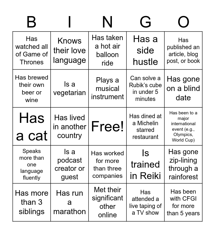 This bingo card has a free space and 40 words: Has a dog, Has a cat, Has travelled to more than 10 countries, Is a vegetarian, Has run a marathon, Has worked for more than three companies, Plays a musical instrument, Has met a celebrity, Has published an article, blog post, or book, Speaks more than one language fluently, Has lived in another country, Has a side hustle, Has been with CFGI for more than 5 years, Has been to a major international event (e.g., Olympics, World Cup), Has dined at a Michelin starred restaurant, Is a podcast creator or guest, Is a Swifty, Has watched all of Game of Thrones, Can recite the alphabet backward in under 10 seconds, Has taken a hot air balloon ride, Has gone zip-lining through a rainforest, Has attended a live taping of a TV show, Can solve a Rubik’s cube in under 5 minutes, Has brewed their own beer or wine, Played a sport in college, Sets up holiday decor after Thanksgiving, Knows the dance routine to "Bye Bye Bye", Has ever gone skydiving, Has ever gone on a solo trip, Has built a fan website for a TV show, Is left handed, Has more than 3 siblings, Makes their own sourdough, Is trained in Reiki, Has gone on a blind date, Met their significant other online, Has changed a flat tire, Was born in October, Knows their love language and Has gone rock climbing.