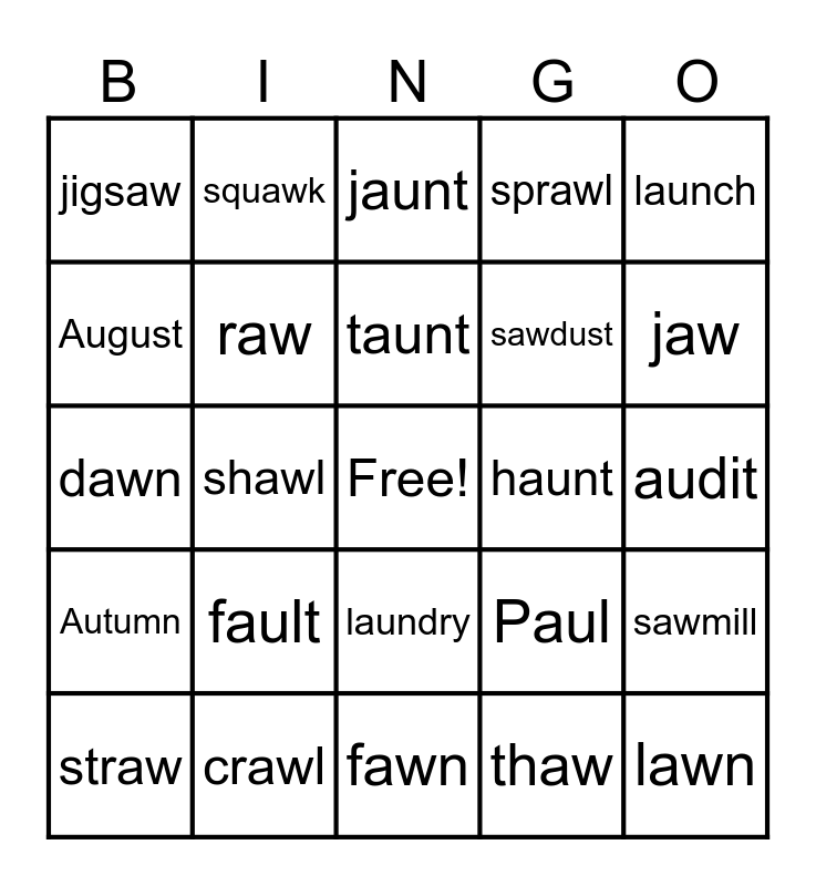This bingo card has a free space and 24 words: fault, crawl, taunt, straw, launch, jigsaw, August, squawk, haunt, laundry, sawdust, dawn, Paul, sawmill, raw, thaw, audit, jaunt, jaw, shawl, lawn, Autumn, sprawl and fawn.