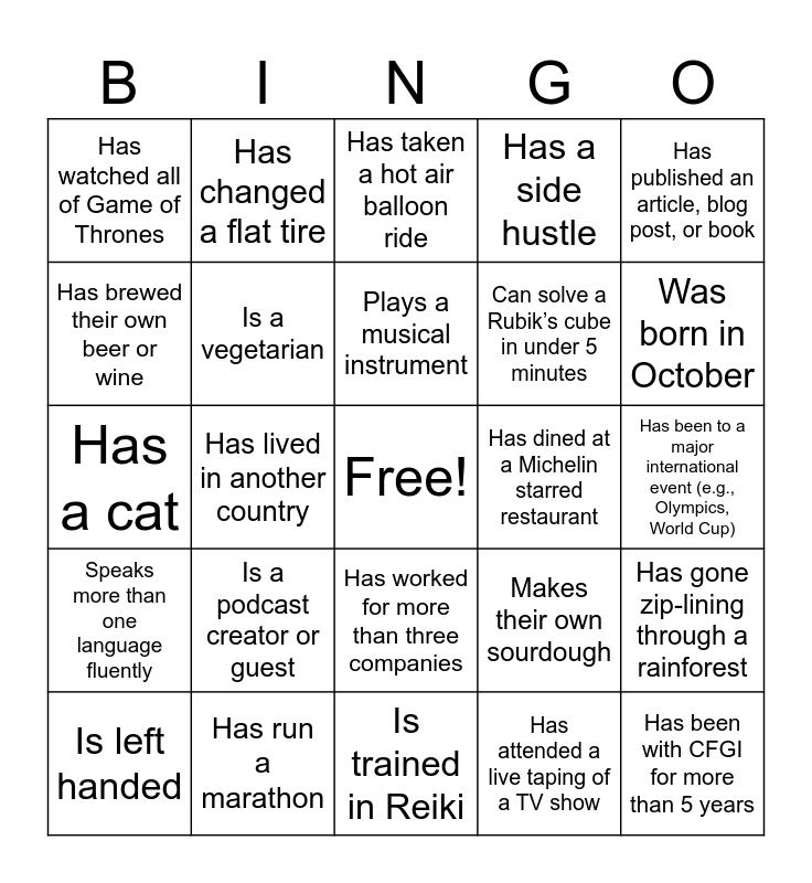 This bingo card has a free space and 40 words: Has a dog, Has a cat, Has travelled to more than 10 countries, Is a vegetarian, Has run a marathon, Has worked for more than three companies, Plays a musical instrument, Has met a celebrity, Has published an article, blog post, or book, Speaks more than one language fluently, Has lived in another country, Has a side hustle, Has been with CFGI for more than 5 years, Has been to a major international event (e.g., Olympics, World Cup), Has dined at a Michelin starred restaurant, Is a podcast creator or guest, Is a Swifty, Has watched all of Game of Thrones, Can recite the alphabet backward in under 10 seconds, Has taken a hot air balloon ride, Has gone zip-lining through a rainforest, Has attended a live taping of a TV show, Can solve a Rubik’s cube in under 5 minutes, Has brewed their own beer or wine, Played a sport in college, Sets up holiday decor after Thanksgiving, Knows the dance routine to "Bye Bye Bye", Has ever gone skydiving, Has ever gone rock climbing, Has ever gone on a solo trip, Has built a fan website for a TV show, Is left handed, Has more than 3 siblings, Makes their own sourdough, Was born in October, Is trained in Reiki, Has gone on a blind date, Met their significant other online, Has changed a flat tire and Knows their love language.
