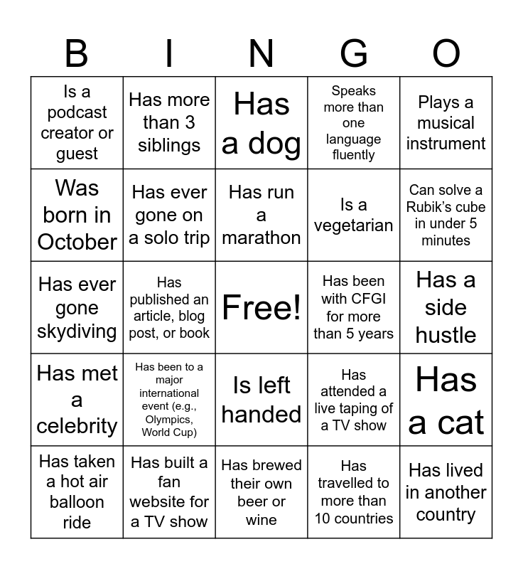 This bingo card has a free space and 40 words: Knows the dance routine to "Bye Bye Bye", Has ever gone skydiving, Has ever gone rock climbing, Has ever gone on a solo trip, Has built a fan website for a TV show, Is left handed, Has run a marathon, Has worked for more than three companies, Plays a musical instrument, Has met a celebrity, Has published an article, blog post, or book, Speaks more than one language fluently, Has lived in another country, Has a side hustle, Has been with CFGI for more than 5 years, Has been to a major international event (e.g., Olympics, World Cup), Has dined at a Michelin starred restaurant, Is a podcast creator or guest, Is a Swifty, Has a dog, Has a cat, Has travelled to more than 10 countries, Is a vegetarian, Was born in October, Is trained in Reiki, Has gone on a blind date, Met their significant other online, Has changed a flat tire, Knows their love language, Has watched all of Game of Thrones, Can recite the alphabet backward in under 10 seconds, Has taken a hot air balloon ride, Has gone zip-lining through a rainforest, Has attended a live taping of a TV show, Can solve a Rubik’s cube in under 5 minutes, Has brewed their own beer or wine, Played a sport in college, Sets up holiday decor after Thanksgiving, Has more than 3 siblings and Makes their own sourdough.