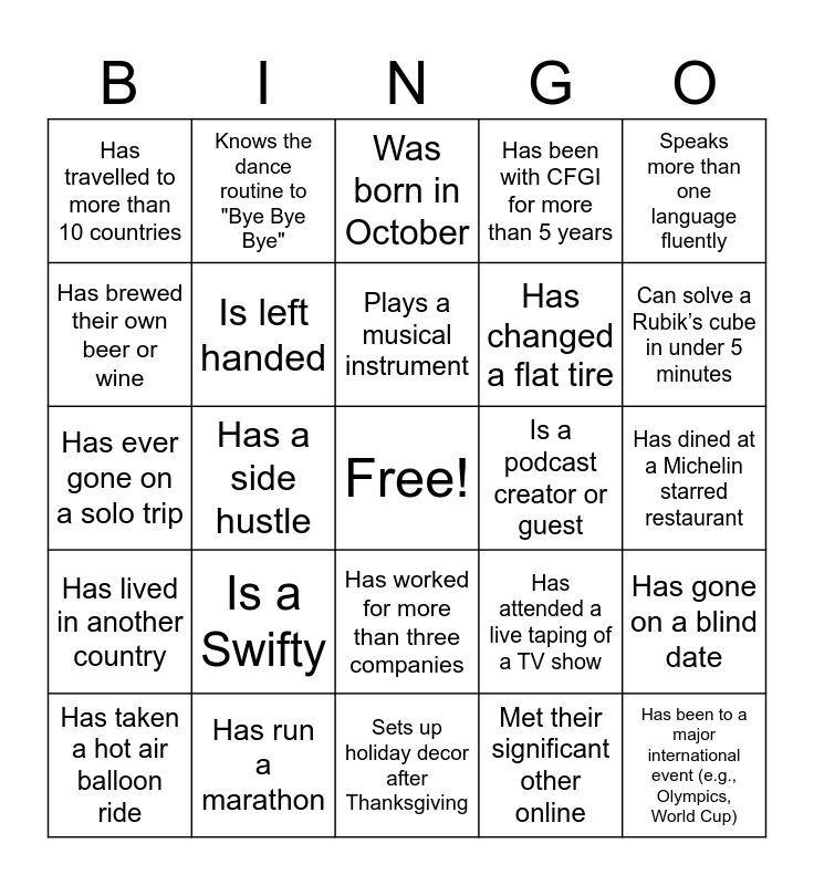 This bingo card has a free space and 40 words: Has ever gone rock climbing, Has ever gone on a solo trip, Has built a fan website for a TV show, Is left handed, Has run a marathon, Has worked for more than three companies, Plays a musical instrument, Has met a celebrity, Speaks more than one language fluently, Has lived in another country, Has a side hustle, Has been with CFGI for more than 5 years, Has been to a major international event (e.g., Olympics, World Cup), Has dined at a Michelin starred restaurant, Is a podcast creator or guest, Is a Swifty, Has a cat, Has travelled to more than 10 countries, Is a vegetarian, Was born in October, Has gone on a blind date, Met their significant other online, Has changed a flat tire, Has brewed their own beer or wine, Played a sport in college, Has a dog, Is trained in Reiki, Has published an article, blog post, or book, Knows their love language, Has watched all of Game of Thrones, Can recite the alphabet backward in under 10 seconds, Has taken a hot air balloon ride, Has gone zip-lining through a rainforest, Has attended a live taping of a TV show, Can solve a Rubik’s cube in under 5 minutes, Sets up holiday decor after Thanksgiving, Has more than 3 siblings, Makes their own sourdough, Knows the dance routine to "Bye Bye Bye" and Has ever gone skydiving.