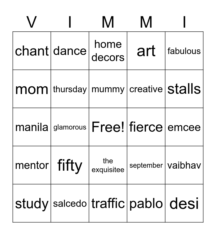 This bingo card has a free space and 29 words: study, fashion, glamorous, delhi, chant, home decors, thursday, fifty, fierce, salcedo, emcee, desi, traffic, pablo, stalls, wife, the exquisitee, mentor, fabulous, manila, september, paintings, creative, mom, art, dance, vaibhav, mummy and vanshi.