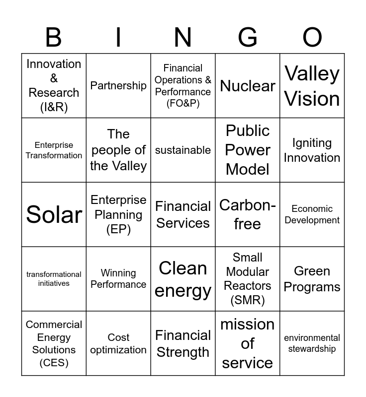 This bingo card has a free space and 29 words: Commercial Energy Solutions (CES), Corporate Accounting, Enterprise Planning (EP), Treasury & Risk, Innovation & Research (I&R), Financial Operations & Performance (FO&P), The people of the Valley, Winning Performance, Carbon-free, Cost optimization, Economic Development, environmental stewardship, Financial Strength, mission of service, Igniting Innovation, Capacity, Clean energy, transformational initiatives, Valley Vision, Solar, Small Modular Reactors (SMR), Strategic Priorities, Public Power Model, Enterprise Transformation, Nuclear, Partnership, Green Programs, sustainable and alignment.