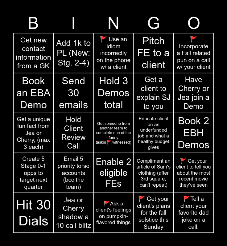 This bingo card has 25 words: Email 5 priority torso accounts (bcc the team), 🚩Ask a client's feelings on pumpkin-flavored things, Hold 3 Demos total, Hit 30 Dials, 🚩 Incorporate a Fall related pun on a call w/ your client, Get new contact information from a GK, Book an EBA Demo, Add 1k to PL (New: Stg. 2-4), Educate client on an underfunded job and what a healthy budget gives, Enable 2 eligible FEs, Get a client to explain SJ to you, Get a unique fun fact from Jea or Cherry, (max 3 each), Compliment an article of Sam's clothing (after 3rd square, can't repeat), 🚩 Get your client to tell you about the most recent movie they’ve seen, Send 30 emails, 🚩Tell a client your favorite dad joke on a call., Book 2 EBH Demos, 🚩 Use an idiom incorrectly on the phone w/ a client, Have Cherry or Jea join a Demo, Hold Client Review Call, Get someone from another team to complete one of the funny tasks(🚩,witnessed), Jea or Cherry shadow a 10 call blitz, Create 5 Stage 0-1 opps to target next quarter, Pitch FE to a client and 🚩 Get your client's plans for the fall solstice this Sunday.