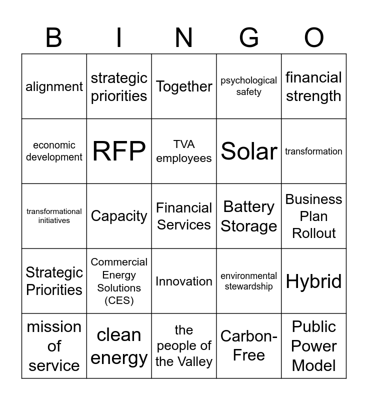 This bingo card has a free space and 29 words: mission of service, Purchased Power, Capacity, customers, alignment, Together, RFP, Commercial Energy Solutions (CES), Battery Storage, clean energy, Business Plan Rollout, Public Power Model, the people of the Valley, Carbon-Free, transformation, Renewable, Innovation, Strategic Priorities, financial strength, transformational initiatives, environmental stewardship, partnership, Solar, economic development, psychological safety, strategic priorities, Hybrid, TVA employees and Future.