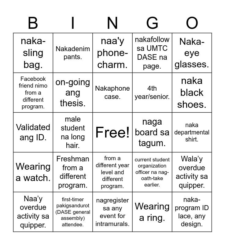 This bingo card has a free space and 30 words: first-timer pakigsandurot (DASE general assembly) attendee., bun hairstyle., male student na long hair., former student organization officer., naka-sling bag., naa'y phone-charm., on-going ang thesis., from a different year level and different program., naga board sa tagum., nagregister sa any event for intramurals., naka departmental shirt., naka-program ID lace, any design., Wearing a ring., intern/wearing a nameplate., naka black shoes., na wala nagsunod sa dresscode., current student organization officer na nag-oath-take earlier., Wearing a watch., Freshman from a different program., Naka-eye glasses., Validated ang ID., Nakaskirt., Nakadenim pants., 4th year/senior., Facebook friend nimo from a different program., nakafollow sa UMTC DASE na page., Wala’y overdue activity sa quipper., Naa’y overdue activity sa quipper., Nakaphone case. and Naka UM official ID lanyard..