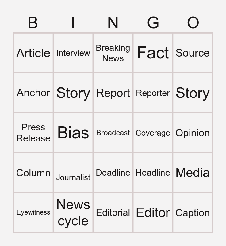 This bingo card has a free space and 24 words: Eyewitness, Journalist, Report, Editor, Source, Article, Interview, Breaking News, Coverage, Opinion, Press Release, Story, Headline, Media, Anchor, News cycle, Editorial, Fact, Story, Column, Bias, Deadline, Reporter and Caption.
