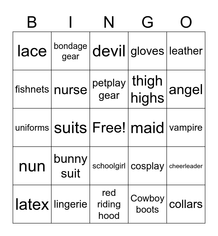 This bingo card has a free space and 24 words: bunny suit, lingerie, petplay gear, latex, leather, lace, fishnets, bondage gear, maid, schoolgirl, thigh highs, uniforms, cosplay, cheerleader, nurse, Cowboy boots, vampire, devil, angel, suits, collars, nun, gloves and red riding hood.