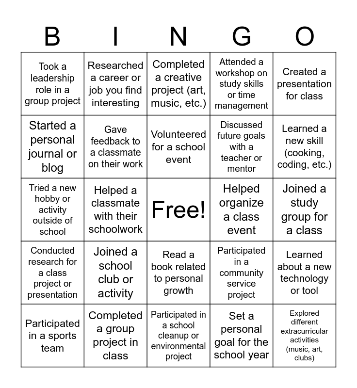 This bingo card has a free space and 24 words: Joined a school club or activity, Completed a group project in class, Volunteered for a school event, Participated in a sports team, Created a presentation for class, Took a leadership role in a group project, Started a personal journal or blog, Researched a career or job you find interesting, Helped organize a class event, Read a book related to personal growth, Discussed future goals with a teacher or mentor, Tried a new hobby or activity outside of school, Participated in a community service project, Learned about a new technology or tool, Gave feedback to a classmate on their work, Set a personal goal for the school year, Joined a study group for a class, Completed a creative project (art, music, etc.), Learned a new skill (cooking, coding, etc.), Helped a classmate with their schoolwork, Explored different extracurricular activities (music, art, clubs), Conducted research for a class project or presentation, Attended a workshop on study skills or time management and Participated in a school cleanup or environmental project.