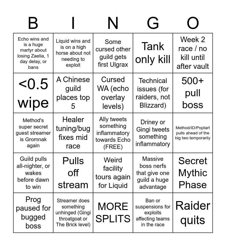 This bingo card has a free space and 24 words: Prog paused for bugged boss, Pulls off stream, Cursed WA (echo overlay levels), Ban or suspensions for exploits affecting teams in the race, Week 2 race / no kill until after vault, Echo wins and is a huge martyr about losing Zaelia, 1 day delay, or bans, Liquid wins and is on a high horse about not needing to exploit, Some cursed other guild gets first Ulgrax, Driney or Gingi tweets something inflammatory, Method/ID/Poptart pulls ahead of the big two temporarily, Method's super secret guest streamer is Gromnak again, A Chinese guild places top 5, Massive boss nerfs that give one guild a huge advantage, Secret Mythic Phase, <0.5 wipe, Streamer does something unhinged (Gingi throatgoat or The Brick level), MORE SPLITS, Tank only kill, 500+ pull boss, Guild pulls all-nighter, or wakes before dawn to win, Healer tuning/bug fixes mid race, Weird facility tours again for Liquid, Technical issues (for raiders, not Blizzard) and Raider quits.