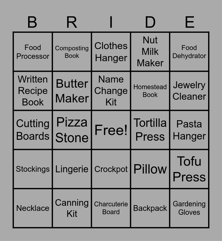 This bingo card has a free space and 24 words: Lingerie, Canning Kit, Name Change Kit, Necklace, Food Dehydrator, Food Processor, Written Recipe Book, Composting Book, Tortilla Press, Crockpot, Homestead Book, Cutting Boards, Pillow, Tofu Press, Butter Maker, Backpack, Pasta Hanger, Clothes Hanger, Jewelry Cleaner, Pizza Stone, Gardening Gloves, Stockings, Nut Milk Maker and Charcuterie Board.