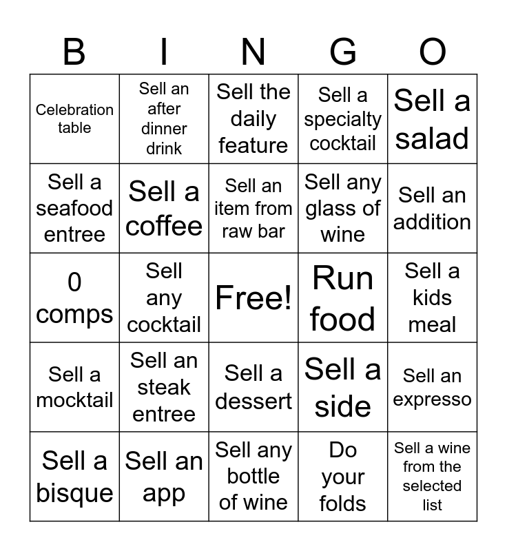 This bingo card has a free space and 24 words: Sell an steak entree, Sell an app, Sell an item from raw bar, Sell a bisque, Sell a salad, Celebration table, Sell a seafood entree, Sell an after dinner drink, Run food, Sell a dessert, Sell any glass of wine, 0 comps, Sell a side, Sell an expresso, Sell a coffee, Do your folds, Sell a kids meal, Sell the daily feature, Sell an addition, Sell any cocktail, Sell a wine from the selected list, Sell a mocktail, Sell a specialty cocktail and Sell any bottle of wine.