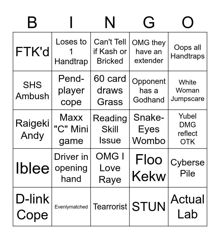 This bingo card has a free space and 24 words: Driver in opening hand, Evenlymatched, 60 card draws Grass, D-link Cope, Oops all Handtraps, FTK'd, SHS Ambush, Loses to 1 Handtrap, Snake-Eyes Wombo, OMG I Love Raye, Opponent has a Godhand, Raigeki Andy, Floo Kekw, Cyberse Pile, Pend-player cope, STUN, Yubel DMG reflect OTK, Can't Tell if Kash or Bricked, White Woman Jumpscare, Maxx "C" Mini game, Actual Lab, Iblee, OMG they have an extender and Tearrorist.